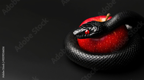 © Nattapol, Obraz premium black snake is coiled around shiny red apple, creating striking contrast against dark background. scene evokes sense of intrigue and mystery