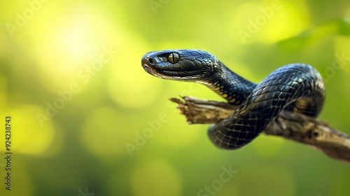 © Thanthara, Fototapeta premium Black snake on a branch defocused green background.