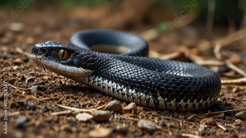 © ProtonemA, Fototapeta premium Black snake on forest ground, alert, nature