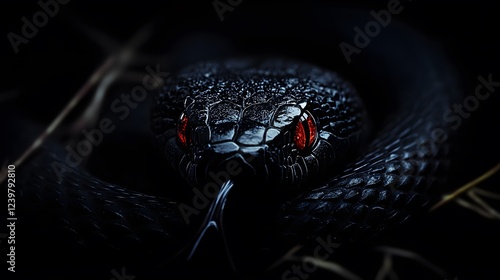 Obraz premium Black Snake with Red Eyes, on Black Background, Abstract Image, Texture,...