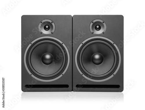© Denis Rozhnovsky, Fototapeta premium Black speaker isolated on a white background.