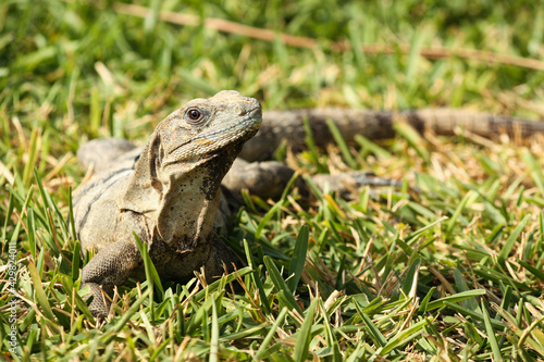 Obraz premium Black spiny-tailed iguana on green grass, Ctenosaura similis, Riviera Maya,...