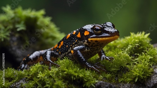 © KAThakshala, Obraz premium Black-Spotted Newt Close-Up on Mossy Rock