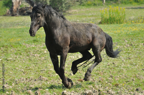 © predrag1, Fototapeta premium black stallion galloping pastures