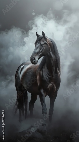 Fototapeta premium Black stallion in fog with dramatic lighting, majestic and powerful concept