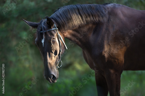 Obraz premium Black stallion portrait in forest in sunlight