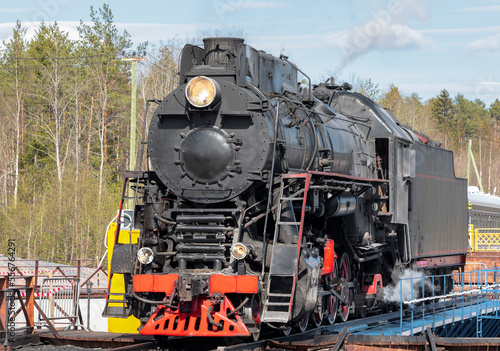 © Sergey, Naklejka premium Black steam locomotive with a burning spotlight on a turning circle against the backdrop of a green forest