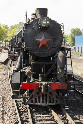 © evannovostro, Naklejka premium Black steam locomotive with red star from USSR times close up