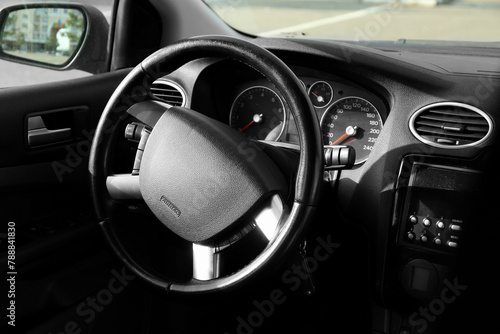 © New Africa, Fototapeta premium Black steering wheel and dashboard in car