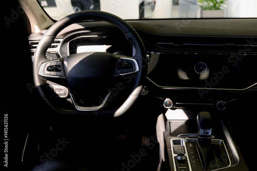 © bo.kvk, Obraz premium Black steering wheel, automatic transmission,control display in a modern car.
