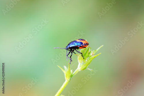 © YuanGeng, Naklejka premium black stinkbug larvae on green leaf