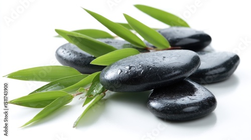 © ngalong project, Fototapeta premium Black stones and green leaves are arranged on a white surface.