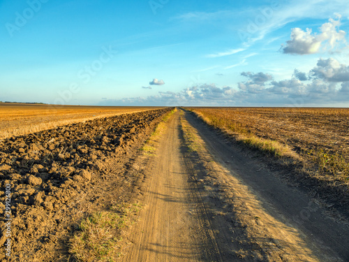 Naklejka premium Black straight path through the autumn levels. Lost on the horizon. Dry grasses in the field. Plowed furrows along the road.