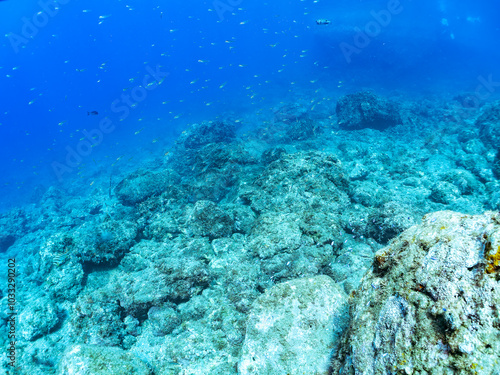 © d3_plus, Fototapeta premium 水中洞窟にいる、美しいミナミハタンポ(ハタンポ科)、クロホシイシモチ(テンジクダイ科)他の幼魚の群れ。 英名、学名:Black-Stripe Sweeper (Pempheris schwenkii), Spotnape cardinalfish (Ostorhinchus notatus), 静岡県伊豆半島賀茂郡南伊豆町中木ヒリゾ浜-2024年