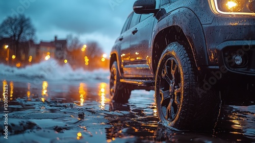 © mlangsen, Fototapeta premium Black SUV travels through a water-filled street in the city at night
