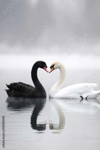 © Lazy_Bear, Fototapeta premium Black swan and white swan swimming on winter lake. Swans face each other with necks forming heart shape