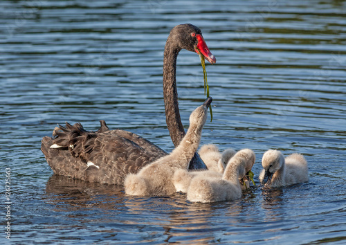 Naklejka premium Black Swan Feeding Cygnets