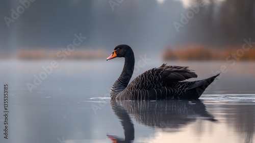 © rasya, Fototapeta premium Black swan swims on misty lake at sunrise