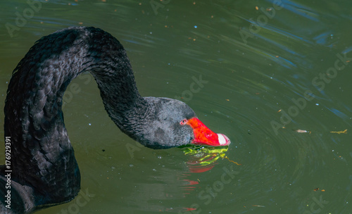© dan, Fototapeta premium Black Swan with Extended Neck Skimming the Rippling Water