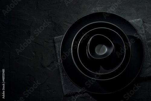 © Ivan, Obraz premium Black tableware on a dark background. Plates and bowls of different shapes and sizes are stacked in a pile. Contrasting dramatic light as an artistic effect.