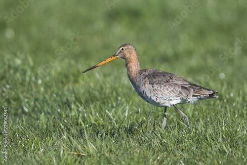 © Erhard Nerger/imageBROKER, Naklejka premium Black-tailed godwit (Limosa limosa) runs on a meadow, East Frisia, Niedersachsen, Germany, Europe