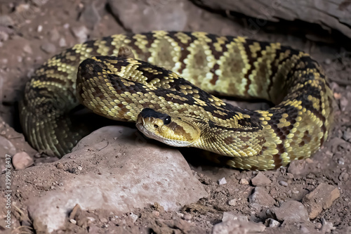 © Erin, Obraz premium Black Tailed Rattlesnake Coiled on Ground Close Up