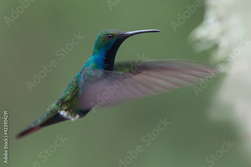 Fototapeta premium Black-throated Mango hummingbird (Anthracothorax nigricollis), male hovering, near Bogota, Colombia.