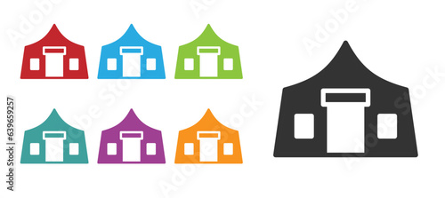 Fototapeta premium Black Tourist tent icon isolated on white background. Camping symbol. Set icons colorful. Vector