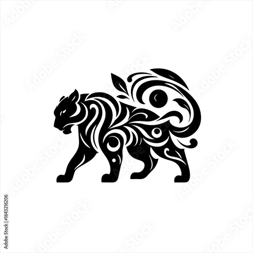 © Rakib Art, Fototapeta premium Black tribal tiger silhouette with floral ornaments