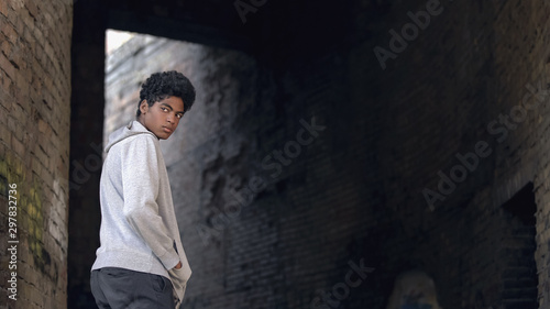 © motortion, Obraz premium Black troubled teenager hanging around city building looking around, sadness