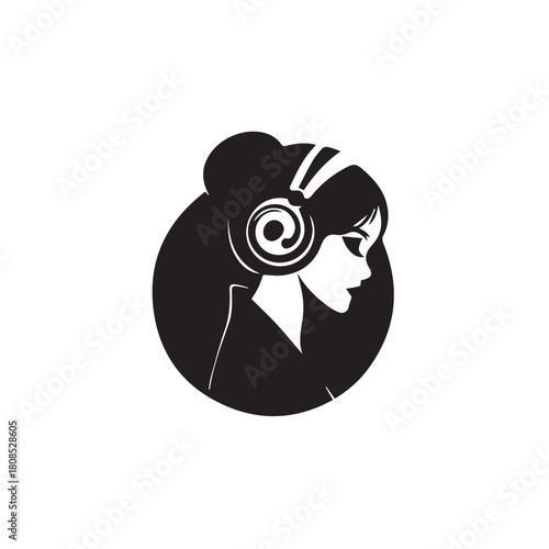 © Gea, Naklejka premium Black Vector Illustration of Woman Wearing Headphone in Clean Minimal Style on White Background