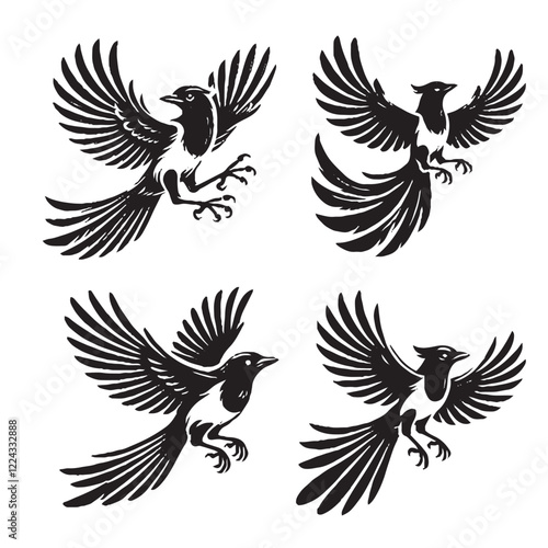 © Furqan, Obraz premium black Vector Silhouette of a Flying Magpie on White Background"