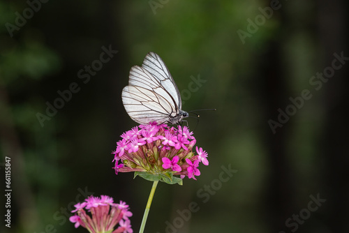 © TAMER YILMAZ, Naklejka premium Black veined White butterfly veins, on purple flower, close-up of a white butterfly in nature, focus on foreground, black background.