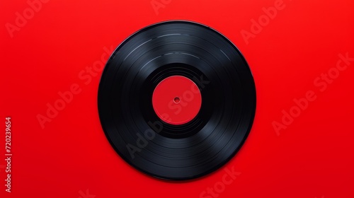 © Vladimir, Fototapeta premium Black Vinyl Record on red background. Image of a Long Play. Sound tracks on a vinyl record