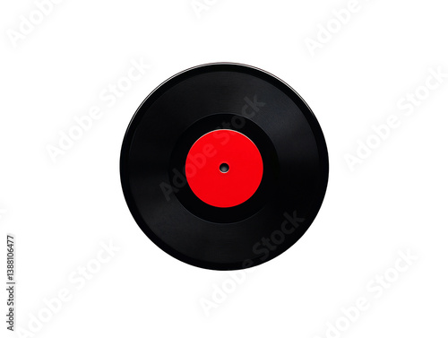 © Amina Graphics IT, Fototapeta premium Black vinyl record with red label in the center, showcasing the grooves of this classic music medium, PNG file isolate on transparent background, cut out, close up, high quality