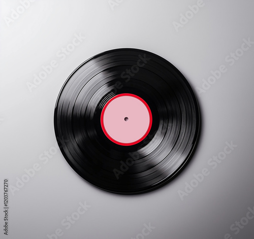 Fototapeta premium Black vinyl record with red label, isolated on light background, showcasing...