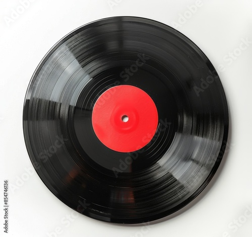 Fototapeta premium Black Vinyl Record With Red Label on White Background