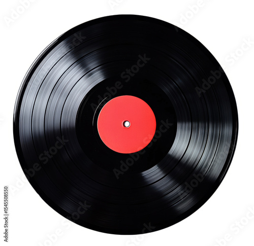 Obraz premium Black vinyl record with red label on white background, showcasing classic...