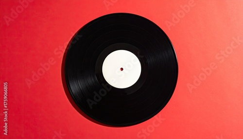 © bella, Fototapeta premium Black Vinyl Record With White Label Center on Red Background Top Down View Classic Music Medium