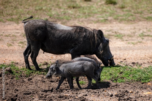 © Wirestock, Fototapeta premium Black warthogs standing in a dirt field with a patch of lush green grass in the background