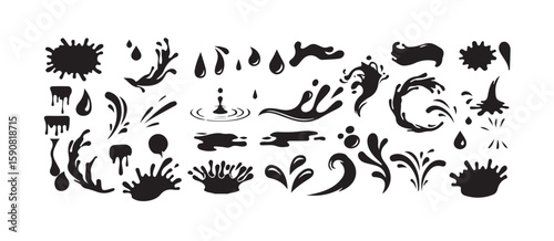 Obraz premium Black Water Splash, Drop, and Wave Silhouettes Elements Pack, Creative Ink Blots Vector Elements, vector illustration eps 10.