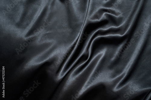 Fototapeta premium Black wavy silk background. Satin fabric texture. Dark elegant rich backdrop. Delicate design. Shine decoration christmas material. Tender art drape. Beautiful romantic textile