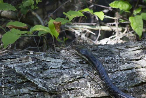Obraz premium Black Western Rat Snake Crawling over a Tree Trunk