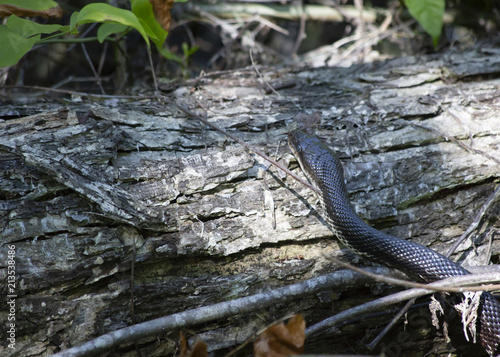 Obraz premium Black Western Rat Snake Crawling over a Tree Trunk