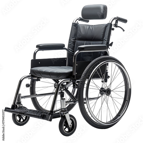 Fototapeta premium Black wheelchair with headrest, armrests, footrests, and large wheels