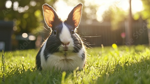 © harjiyo, Fototapeta premium Black-white bunny sits in sunny garden, backyard bokeh