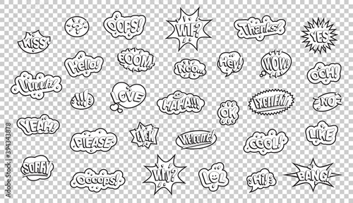 Fototapeta premium Black white comic style stickers. Slogans on a transparent background.
