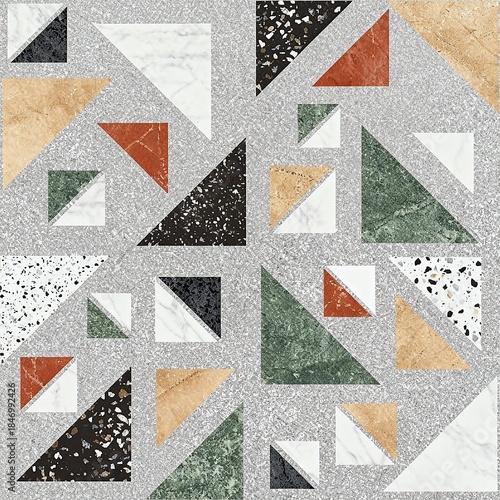 © PixelArt Studio, Obraz premium black-white terrazzo stone and multicolour marble stone arranged in a geometric pattern on grey marble background, decorative wall tiles and interior design