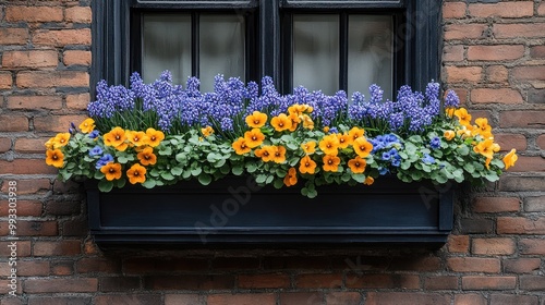 © lulu Alana, Fototapeta premium Black window box with decorative flowers on a brick wall in a city.
