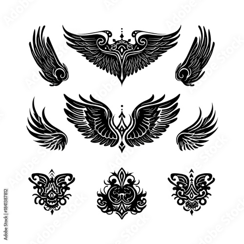 © Jahanzaib, Obraz premium Black Wing Tattoos with Ornate Designs on White Background